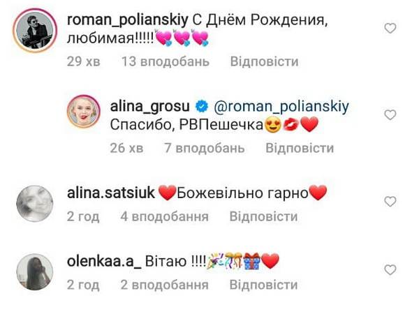 Роман Полянський, з яким у Аліни романтичні стосунки, одним з перших відреагував на пост іменинниці і залишив привітання з освідченням у коханні.