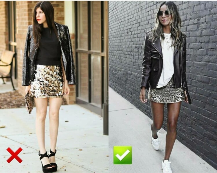 У повсякденних образах акцентні речі (наприклад, спідниця з паєтками) краще комбінувати з простими базовими речами-компанйонами. Зліва на дівчині крім акцентної спідниці також паєточний піджак, блискучий клатч і босоніжки на високих підборах. Навіть для свята такий комплект – перебір за блиском. Справа ж спідниця виступає єдиним акцентом, її “утихомирює” базова футболка, білі кеди і косуха.