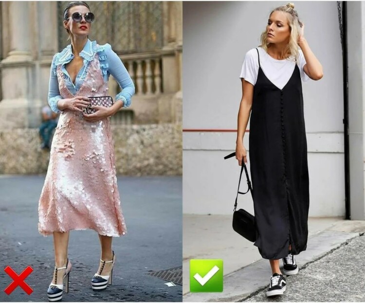 Поєднання сукні на бретельках поверх футболки – досить популярне і в якійсь мірі вже класичне. Краще, щоб під сукнею виявився простий базовий нижній шар – однотонна футболка, блузка або водолазка. А ось акцентний нижній шар з принтом, декором, рюшами – не найкращий варіант.