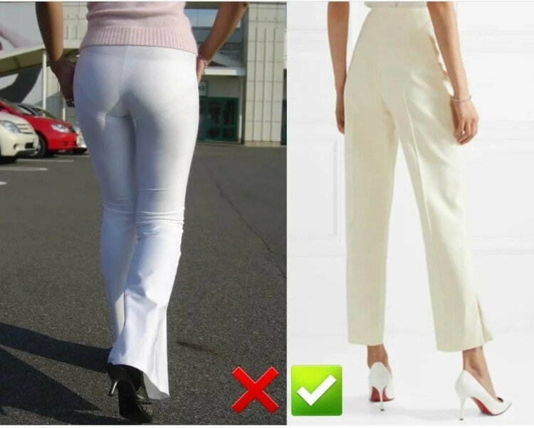 Просвічувана з-під одягу білизна, нехай навіть біла, виглядає дуже непривабливо. Часто таке можна побачити на жінках в білих штанах. Як боротися? По-перше, шукаємо штани з більш щільної тканини. По-друге, надягаємо безшовну тілесну білизну, що збігається по відтінку з тоном вашої шкіри.