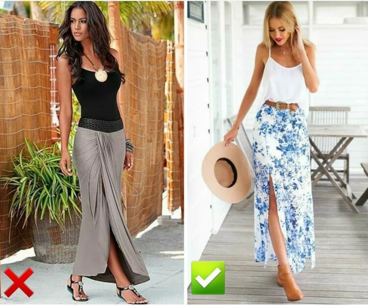 Почнемо зі спідниць-максі. Спідниця в підлогу на низькій посадці буде порушувати пропорції тіла, роблячи ноги коротше, а тулуб – довшим. Ситуацію зліва посилює ще і широкий чорний пояс, який зливається з топом і ще більше подовжує тулуб. Спідниця-максі вільного крою завжди трохи краде ріст, тому носити її краще з підборами. І обов’язково посадіть її на талію, зробивши додатковий акцент ременем.