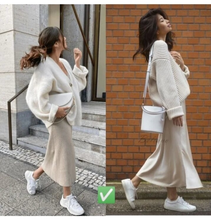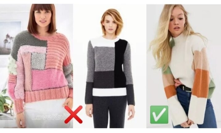 Тренд сезону 2020-2021 “колор-блок”. Светр справа відрізняється фасоном, природними відтінками та якістю. Експерименти з різними текстурами від хутра до трикотажу в одному виробі є неприйнятними.