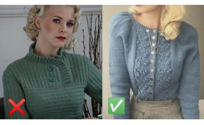 Цього року повернулася мода на скромні кофтини з 80-х років. Вітаються мініатюрні візерунки, фантазійні манжети, комірці, рукави як на фото праворуч. На фото зліва: дивний асиметричний крій, дешева пластмасова фурнітура та відсутність рельєфу перетворили молоду дівчину-модель на жінку без смаку.