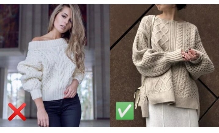 На фото праворуч великі візерунки, воріт та манжети зробили светр трохи важким та твердим на вигляд. На фото зліва вільний крій та асиметрична в’язка, а також повітряні рукави дуже цікаво та дорого виглядають.
