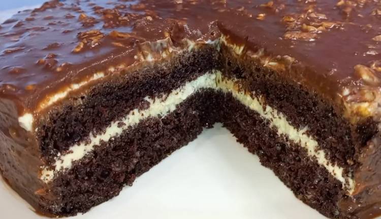 Шоколад заливаємо молоком і додаємо трохи вершкового масла. Розтоплюємо, перемішуємо, всипаємо подрібнені горіхи і перемішуємо. Поливаємо готовий торт.