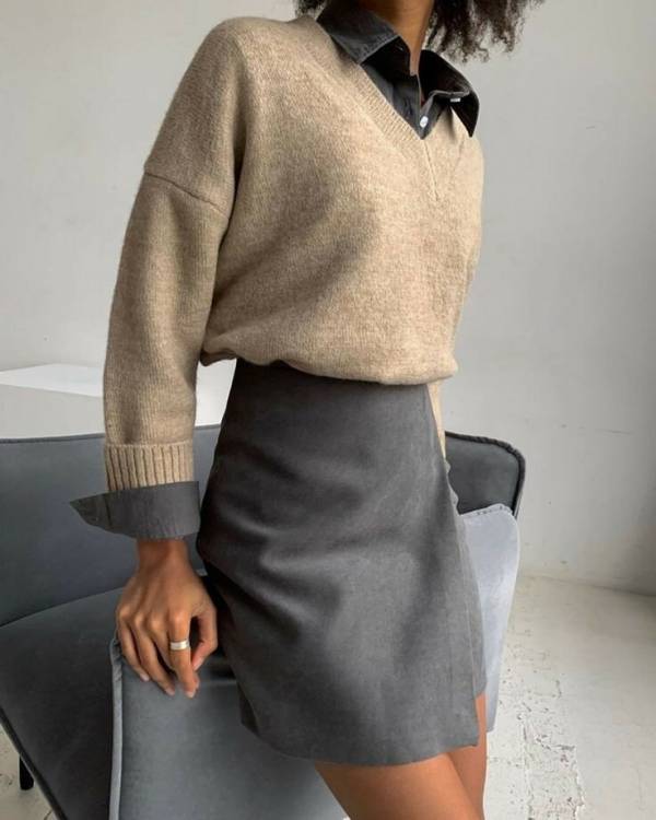 Верх у сіро-зеленому кольорі дружить із низами теплих відтінків: бежевим, шоколадним.