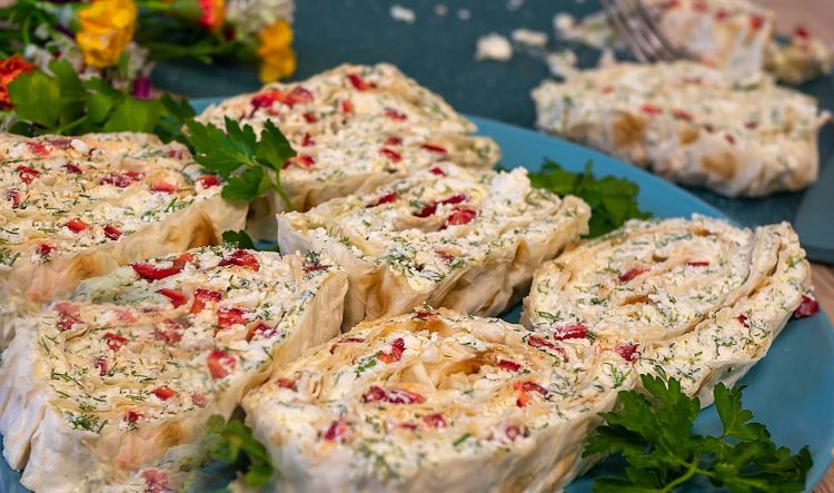 Загортаємо рулет у фольгу і залишаємо до приходу гостей, нам потрібно, щоб він просочився. Після цього нарізаємо на порційні шайбочки