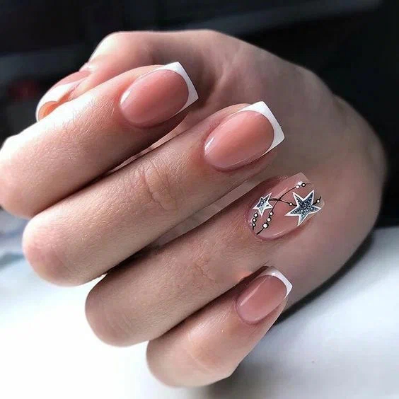 Третій варіант святкового манікюру з урахуванням класичного френча, виконаного на нігтях прямокутної форми. Дизайн – простий малюнок на нігті четвертого пальця, виконаний сріблястим та чорним лаком.