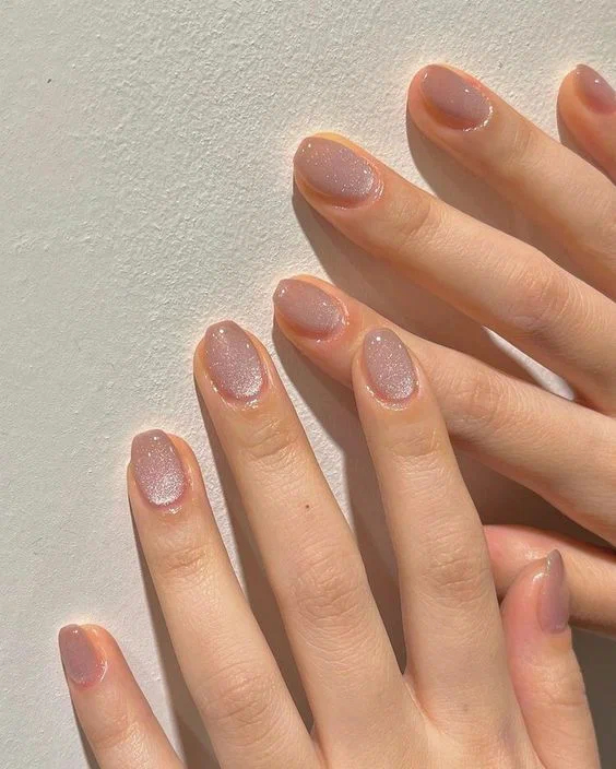 Простий манікюр з нюдовим покриттям та застосуванням спеціальної пудри. В результаті нігтики виглядають так, ніби вони припорошені сніжинками, що переливаються на світлі.