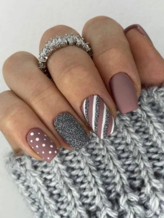 Манікюр із простим, але різноманітним дизайном. Основне покриття – темно-бежеве, тільки на четвертому пальці – сріблясте покриття. На третьому пальці – малюнок у вигляді білих та сріблястих смуг, що проходять по діагоналі. На п’ятому пальці – найпростіший малюнок із білих крапок.