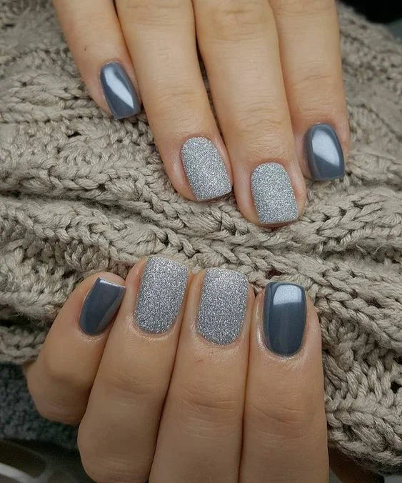 Дуже простий варіант манікюру, який виглядає досить ефектно. Для його виконання використано два види лаку – сріблястий та сірий із глянсовою поверхнею. Сріблясте покриття на двох пальцях – третьому та четвертому.