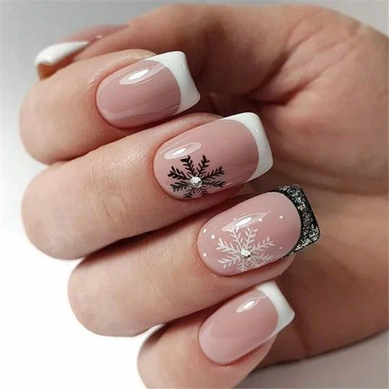 Класичний френч також можна зробити святковим. Для цього на нігті третього пальця виконаний чорним лаком малюнок у вигляді сніжинки, центр якої прикрашений мініатюрним стразом. На четвертому пальці – така ж сніжинка, а “усмішка” виконана не білим, як на решті нігтів, а чорним лаком. На чорному тлі ефектно виглядають сріблясті включення.