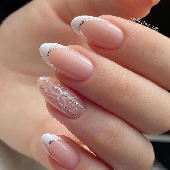 Основа цього святкового манікюру – також класичний френч. Доповнюють його малюнок, виконаний білим лаком, на нігті четвертого пальця, а також тонкі сріблясті смужки на межі основного покриття та «усмішки».