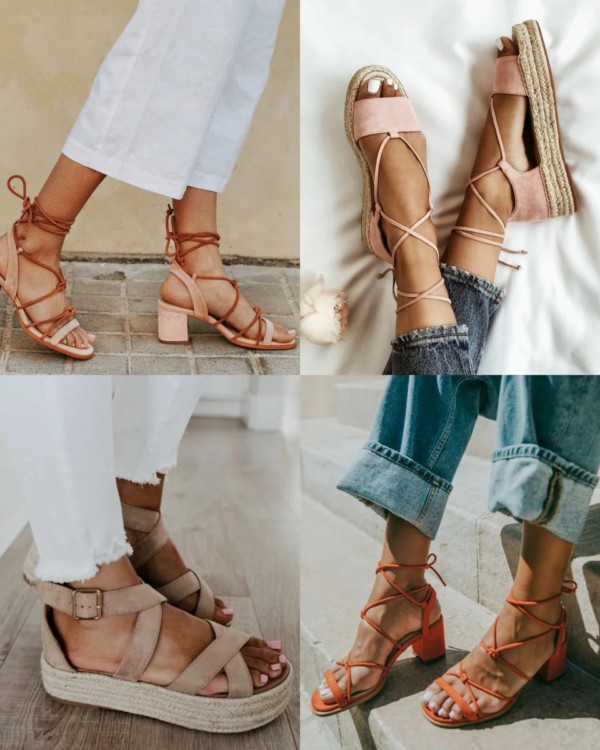 Подібні моделі взуття подобаються дуже багатьом, адже босоніжки з тонкими ременями виглядають на ногах акуратно і не збільшують розмір. Зав’язані в кілька оборотів ремінці ніби створені для модних суконь довжини міді і відмінно поєднуються з широкими джинсами.