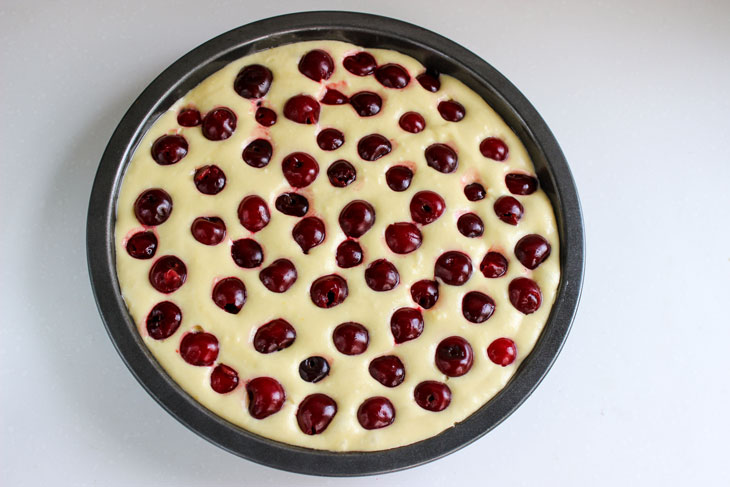 Вишню попередньо відкидаємо на друшляк, щоб стік весь сік. Оскільки через нього пиріг нормально не пропечеться. Ягоди викладаємо хаотично на тісто і вдавлюємо.