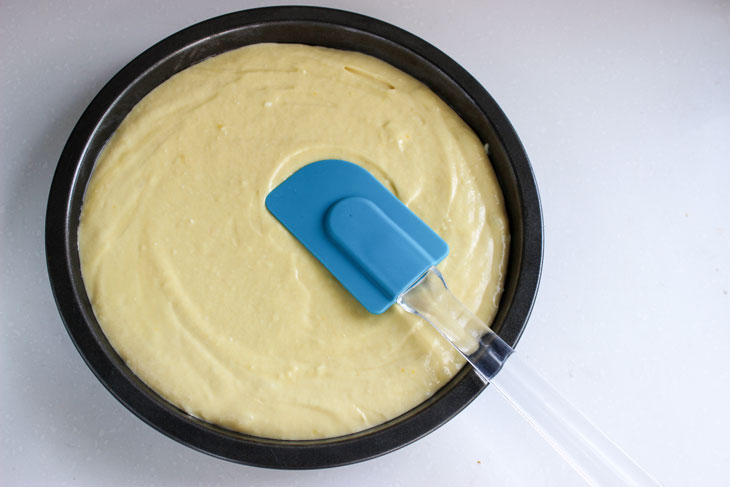 Духовку включаємо на 180-190 °, щоб розігрілася. Форму діаметром 23 см змащуємо декількома крапельками соняшникової олії без запаху. Тепер викладаємо в неї тісто і рівняємо.