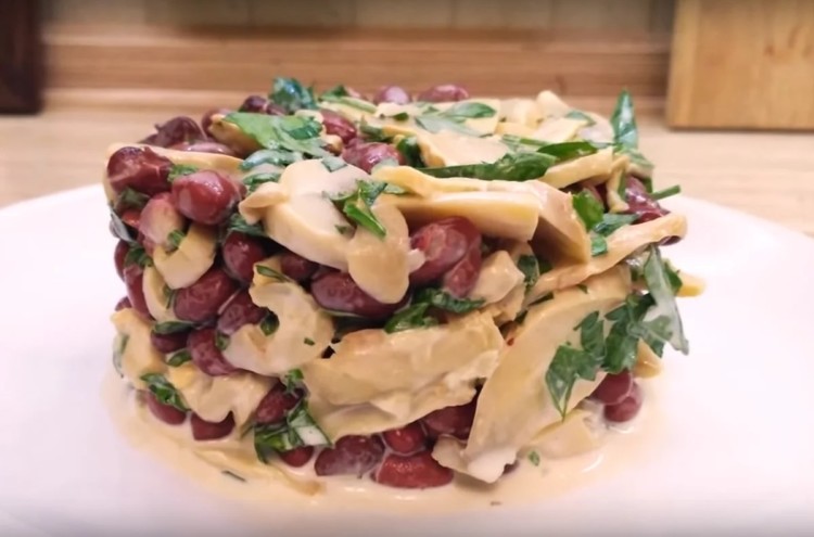 Висипаю гриби і квасолю в миску. Рідину попередньо злила. Дрібно нарізаю пучок петрушки. Відправляю нарізану петрушку в миску. У салат видавлюю через прес два маленьких зубчики часнику. Злегка солю, можна поперчити за смаком. Додаю 1 столову ложку майонезу. Ретельно перемішую. Викладаю салат в сервіровочне кільце.