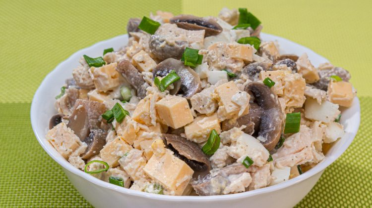 Дуже простий у приготуванні, проте неймовірно смачний салат із куркою, грибами та сиром. Такий салат чудово підійде на будь-яке свято. Він апетитний і в міру ситний. Всі інгредієнти в ньому чудово поєднуються, тому такий салат просто не може не сподобатися. Особливу пікантність цьому салату з куркою та грибами надає зелена цибуля.