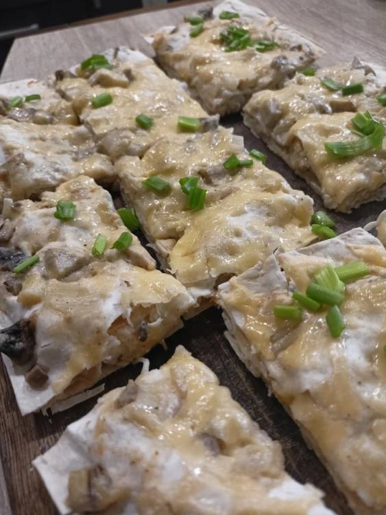 Нарізаю гриби 150 г і обсмажую все разом до випаровування рідини. Солю, перчу до смаку, додаю спеції (базилик, паприку). Кладу сметану (вершки) перемішую і тушу ще хвилин 7. Додаю 1 ст. л. крохмалю і перемішую.