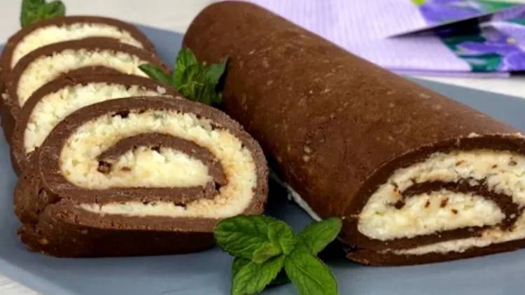 Готується швидко, на смак у міру солодкий та дуже ніжний. У літню спеку саме те! Не потрібно вмикати духовку чи плиту. До того ж, перед подачею рулет настоюється в холодильнику, а їсти його прохолодним — одне задоволення!