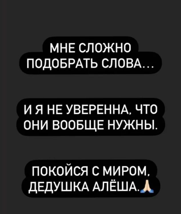 “Шкода, що слідом за хорошими новинами приходять погані”, – написала телеведуча. А через деякий час додала: “Мені складно підібрати слова. І я не впевнена, що вони взагалі потрібні. Спочивай з миром, дідусь Альоша”.