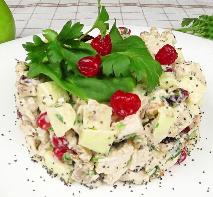 Якщо ви плануєте святкову вечерю, то цей салат для вас. Легкий і швидкий в приготуванні, а на новорічному столі це просто родзинка. Горіхи і ягоди гармонійно поєднуються з відварною куркою та яблуками, а вкраплення маку мимоволі притягують погляд до цього салату.