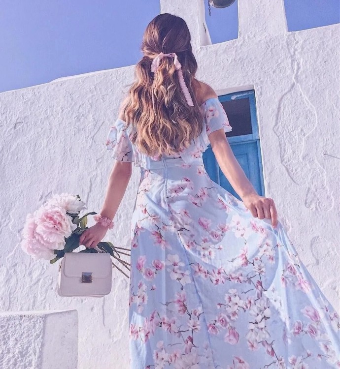 Гармонійно впишуться в романтичний гардероб принти: квіткові мотиви, горох, силуети тварин і птахів, комахи (метелики, бабки), ягоди, серця, дрібні геометричні фігури і плавна абстракція.