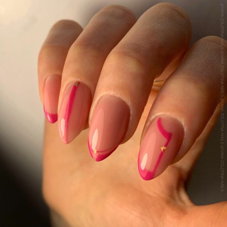 Якщо ми заговорили про другу смужці, то слід показати вам як виглядає подвійний френч, що не перевантажений декором. Як видно на фото, це дуже елегантний різновид французького манікюру, особливо якщо ви використовуєте золотий колір в парі з рожевим і доповнюєте дизайн невеликими лаконічними стразами.