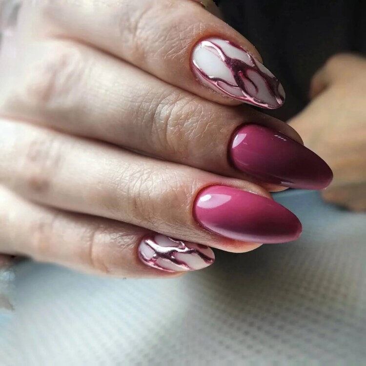 Також прекрасною ідеєю для новорічного манікюру вважається в’язана техніка, яка більше нагадує светр. Вона виконується за допомогою акрилової пудри. Розмістивши таку техніку на одному нігті, ви зробите свій дизайн більш цікавим і максимально зимовим, в тому числі якщо додасте в нього й інші тематичні малюнки. Наприклад, в рожевому манікюрі можна розмістити сніжинки, оленів, символ 2021 року і так далі. Не бійтеся підключати уяву і прикрашати нігтики іншими відтінками в парі з рожевим, а також хитромудрими новомодними техніками – абстракцією, асиметричним або круговим френчем і так далі.