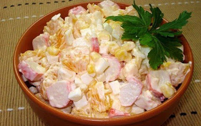 Салат із крабових паличок з кукурудзою і апельсином перекласти в салатник і подати до столу.