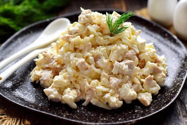 Запропонований салат виходить ніжним, легким, повітряним, при цьому дуже ситним і поживним. Всі компоненти мають білий колір, а сам салат для подачі викладається у вигляді невеликої гірки. Нейтральний смак відвареного курячого філе і яєць доповнює кислуватий сир Фета. Цей смачний салат готується дуже швидко і просто, під силу навіть початківцю кулінарові.