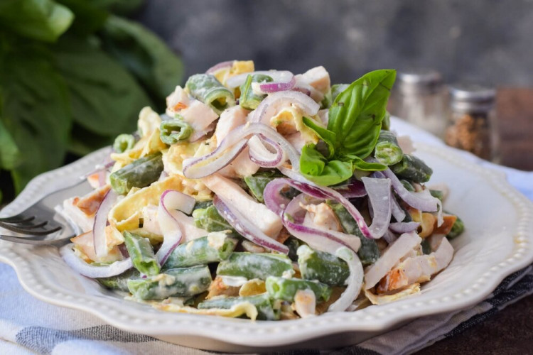 Приготуємо смачний салат всього з 4-х інгредієнтів – шинка, квасоля, яйця, цибуля. Поєднання продуктів виходить гармонійним, салат досить соковитий, присутня приємна кислинка маринованої цибулі. З яєць ми приготуємо яєчні млинці, які чудово підходять для салатів. Стручкову квасолю можна використовувати свіжу або заморожену. Беріть рецепт на замітку, адже такий салат відмінно підійде для свята і на кожен день.