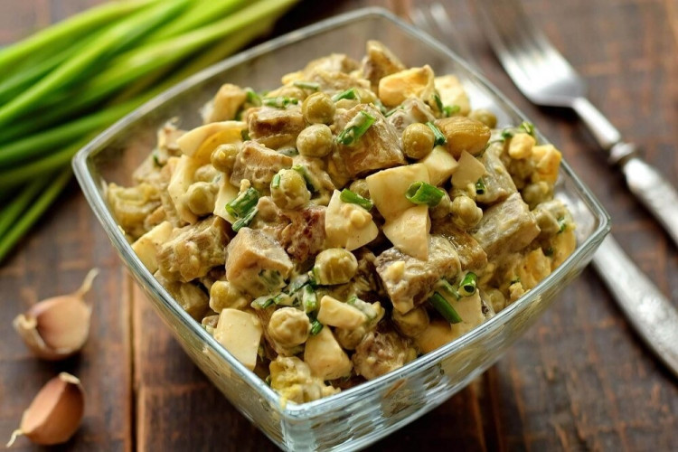 Даний салат яскравий приклад того, як з невеликої кількості продуктів можна приготувати смачне і ситне блюдо, при цьому досить швидко. Баклажани в салатах гармонійно поєднуються з вареними яйцями, консервованим горошком і зеленою цибулею. Заправляється салат майонезом або сметаною на вибір, також можна з’єднати ці два соуси. Для пікантності використовується трохи часнику.