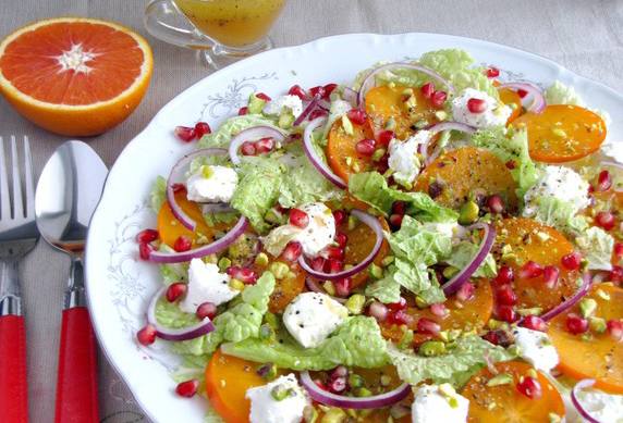 Порвіть листовий салат. Наріжте хурму шматками. Викладіть ці інгредієнти на тарілку. Зверху розподіліть страчателлу. Посипте зернами граната. Полийте оливковою олією. Прикрасьте цибулею.
