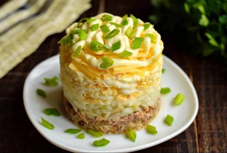 • Зверху зробіть смужки з майонезу. Зелену цибулю промийте, наріжте навскоси невеликими кільцями. Цибулею посипте верхівку салату.