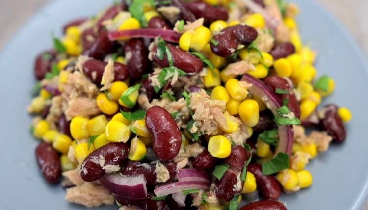 Апетитний, незвичайний, корисний та смачний салат з тунцем, квасолею та кукурудзою. Готується дуже швидко і просто (без варіння, проблем і зайвого клопоту). Ділюсь рецептом з Вами.