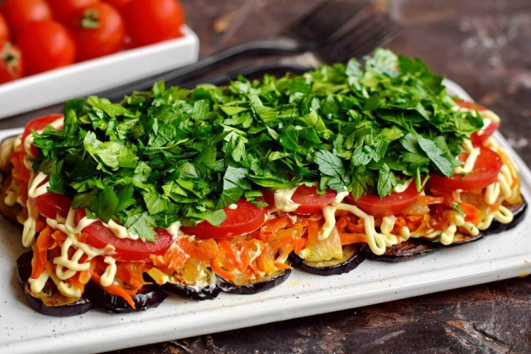 Смажені баклажани, промокніть серветками, позбавляючи їх від олії. Після перекладіть на плоске блюдо в кілька рядів, посоліть. У майонез додати подрібнений часник, перемішайте. Отриманий соус помістіть в кондитерський мішок. На баклажанах зробіть густу сітку з соусу.