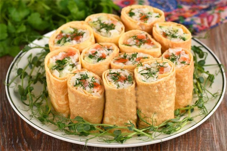 У такий спосіб можна подавати будь-який салат, який готується у змішаному вигляді (не шарами) та у його складі є курячі яйця. Цю страву можна назвати і салатом, і закускою. Виходить салат у порційних трубочках (рулетиках). Сьогодні його готую з червоною рибою, свіжими огірками та рисом. Салат соковитий, смачний та дуже гарний. Всі продукти чудово поєднуються між собою.