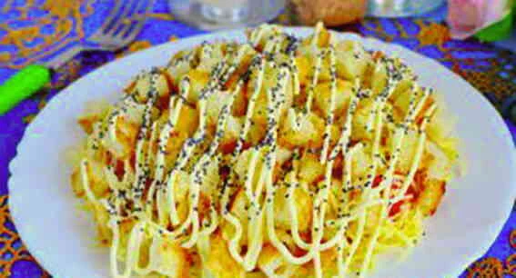 - Для салату можна використовувати відварне або копчене куряче філе. М’ясо наріжте брусками викладіть на блюдо, полийте майонезом, трохи посоліть і приправте.