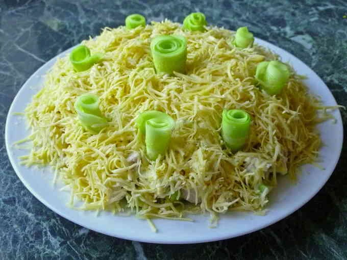 - Завершіть салат шаром з тертого сиру. Прикрасьте салат на свій смак і подавайте на стіл.
