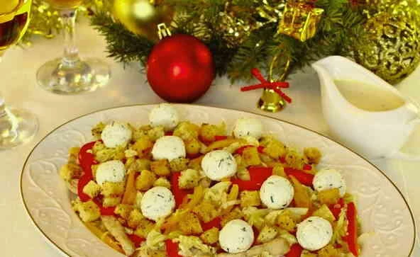 - Основу салату викладіть на блюдо, полийте заправкою і розсипте зверху сухарики. Поверх салату розкладіть сирні кульки і подавайте його на стіл.