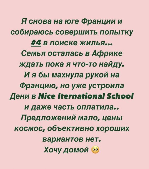 “Я знову на півдні Франції і намагаюся зробити спробу №4 у пошуку житла. Сім’я залишилася в Африці чекати, поки я щось знайду. Я махнула б рукою на Францію, але вже влаштувала Дені в Nice International School і навіть частину сплатила. Пропозицій мало, ціни космос, об’єктивно, хороших варіантів немає. Хочу додому”, – написала Санта.