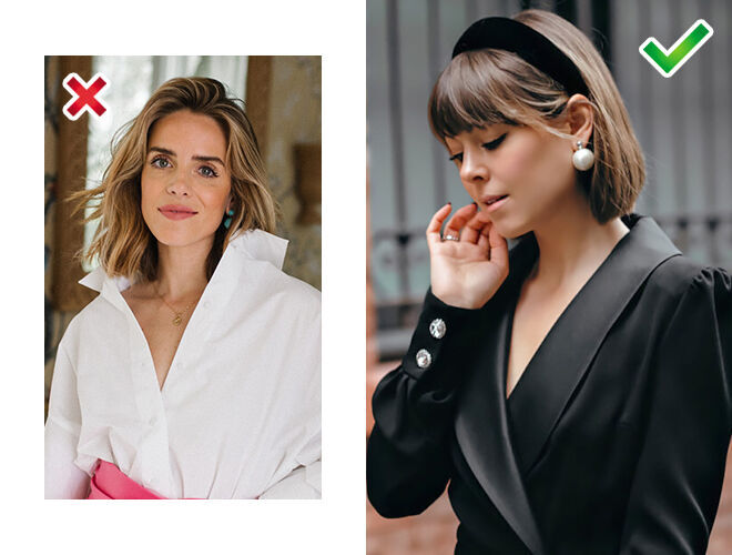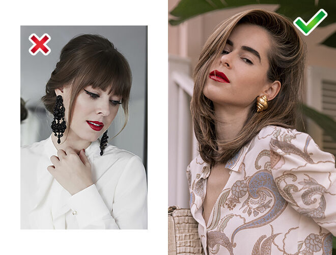 Як виправити: Щоб ваші сережки сяяли та створювали потрібні акценти, вибирайте зачіску, що відкриває вуха. Це може бути недбалий пучок з парою випущених біля обличчя прядок, високий хвіст або зачесане назад волосся. Якщо ж хочеться піти з розпущеними кучерями, створіть акцент на одній сережці. Для цього закріпіть пасма волосся за вухом або недбало перекиньте його на інший бік.