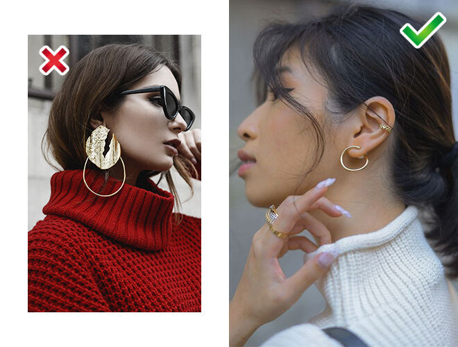 Як виправити: Відмовтеся від подовжених аксесуарів, у тому числі варіантів з підвісками. Ідеальним доповненням до водолазок та светрів з високим горлом стануть невеликі сережки-конго та «калачі», гвоздики, незвичайні клаймбери або масивні сережки-джекети. Будь-яку з цих моделей можна одягнути разом із стильним каффом, який додасть їм родзинку.