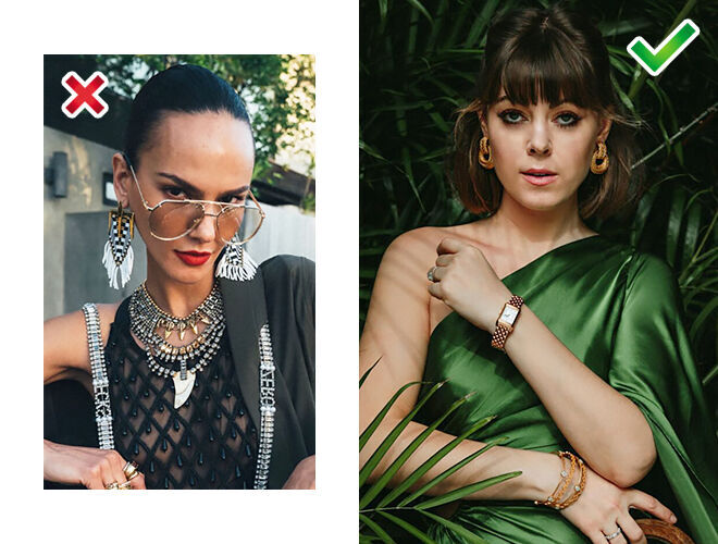 Як виправити: Щоб не виглядати несмачно, поєднуйте масивні сережки з великими кільцями або браслетами, а ось шию залиште голою. Або обмежтеся мінімалістичним чокером, тільки простежте, щоб він був «з однієї опери» із сережками.