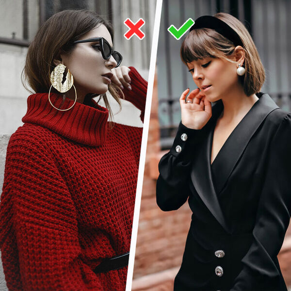 Як виправити: Відмовтеся від подовжених аксесуарів, у тому числі варіантів з підвісками. Ідеальним доповненням до водолазок та светрів з високим горлом стануть невеликі сережки-конго та «калачі», гвоздики, незвичайні клаймбери або масивні сережки-джекети. Будь-яку з цих моделей можна одягнути разом із стильним каффом, який додасть їм родзинку.