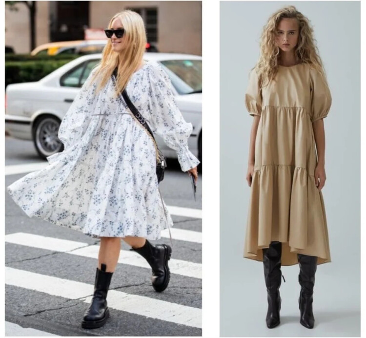 Ми із задоволенням носили подібні сукні все літо, і продовжуємо створювати образи з ними і восени. Якщо влітку були більш актуальні сукні-парашути в довжині міні, то коли похолодає, міді все ж буде доречніше. Поєднуємо їх із закритим взуттям (ті ж армійські черевики, кросівки, або навіть чоботи), поверх накидаємо, наприклад, шкіряну куртку-косуху.