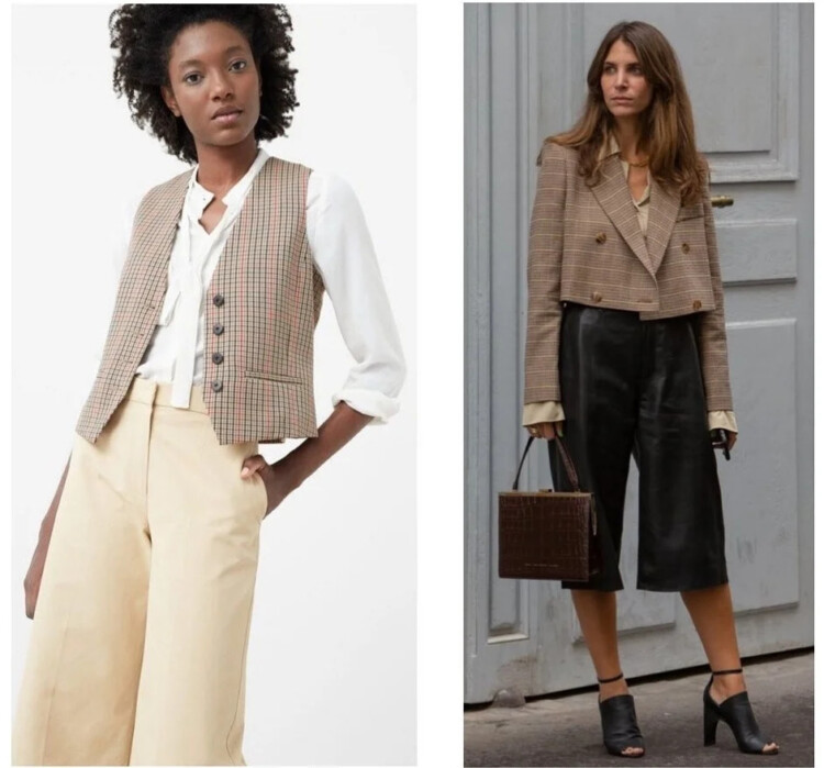 Костюмні жилети – це досить свіжий тренд. Щоб адаптувати його в свій гардероб, носіть жилет в костюмі-трійці або ж окремо поверх блуз або водолазок, вийде стильна багатошаровість. Можна навіть на голе тіло – теж виглядає дуже трендово. Ну а укорочений жакет ми носимо як звичайний. До речі, він чудово подовжує ноги!