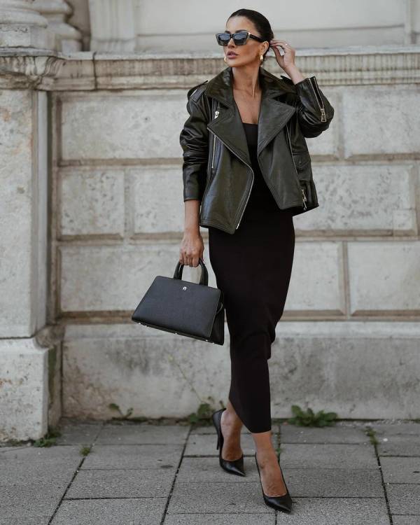 Актуальна для роботи осіння шкіряна куртка, що становить відмінні тандеми зі штанами, спідницями, джинсами.
