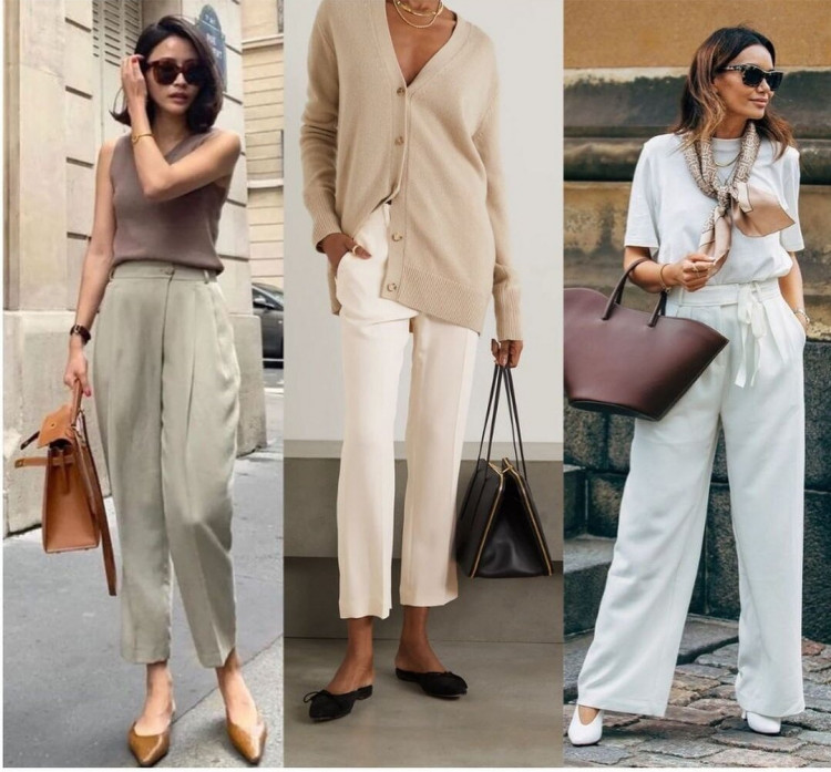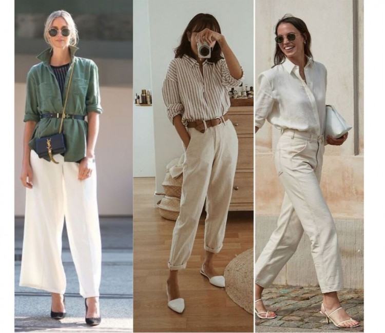 Більш класичні костюмні брюки (з літніх тканин) можна поєднувати з будь-якими топами, не тільки сорочкою. Підійдуть різні блузи, футболки, топи в білизняному стилі. Класно виглядає офісне поєднання штани + кардиган на ґудзиках, але в жарку погоду в такому комплекті, швидше за все, буде некомфортно. Хоча, якщо в офісі постійно працює кондиціонер, то чому б і ні.